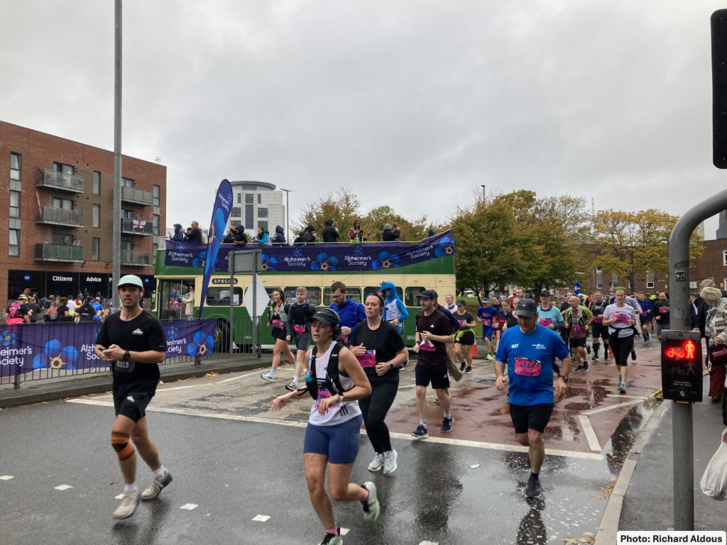 It was a wet day, but the enthusiasm of the Alzheimer's Society cheering team did not falter, they continued until the very last runner had passed.